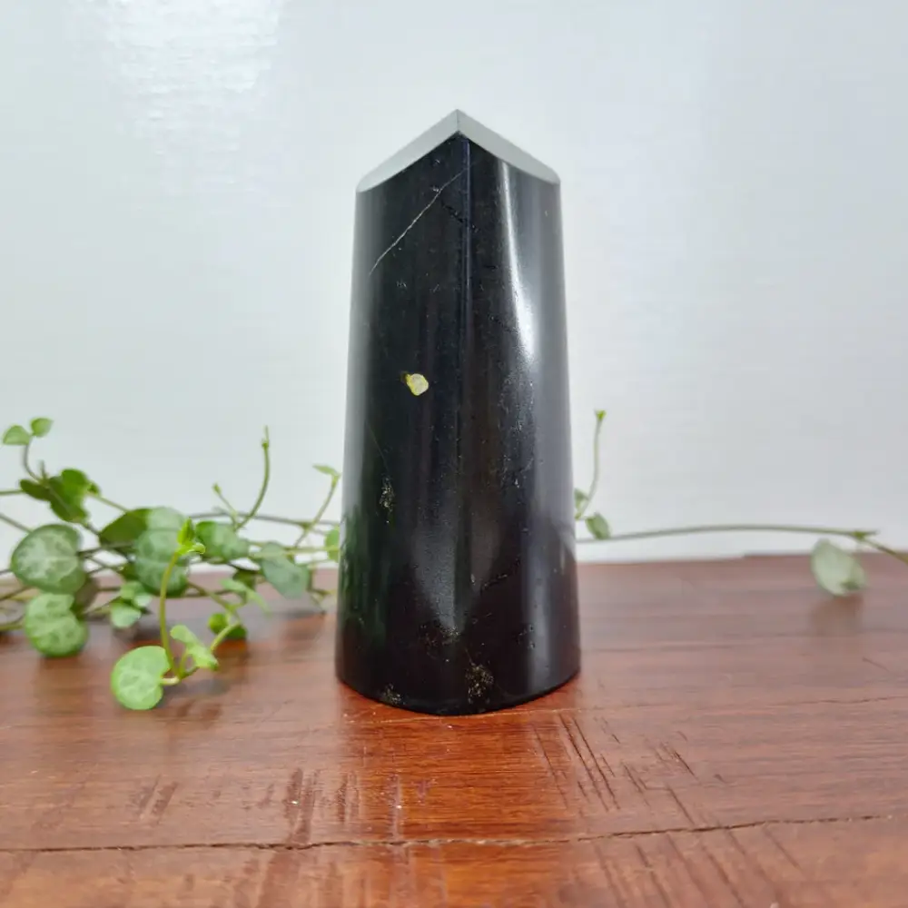 The Black Tourmaline Tower is a powerful protective crystal carved into a pointed tower shape to direct and ground energy. Known as one of the strongest stones for protection, Black Tourmaline is believed to shield against negative energies, psychic attacks, and environmental stress. The tower shape helps channel unwanted energy downward into the earth, promoting stability, grounding, and emotional security. Its deep black color symbolizes strength, resilience, and energetic defense.